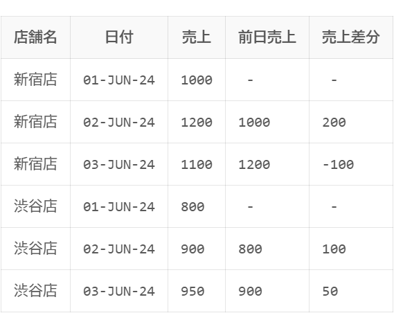 売上 - lag(売上) over(partition by 店舗名 order by 日付) as 売上差分