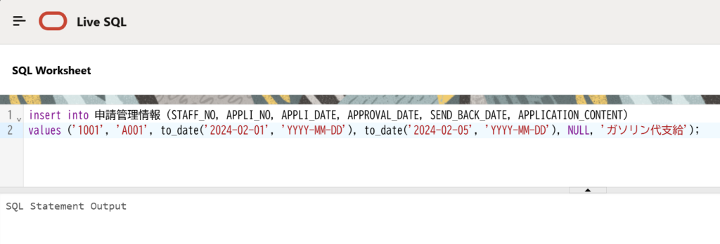 括弧内の列名: (STAFF_NO, APPLI_NO, APPLI_DATE, APPROVAL_DATE, SEND_BACK_DATE, APPLICATION_CONTENT) は、追加したいデータを入れる列の順序を指定します。
