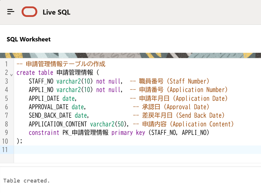 申請内容の詳細 varchar2(100), -- 申請の詳細内容を格納するカラム(適宜サイズを調整してください)