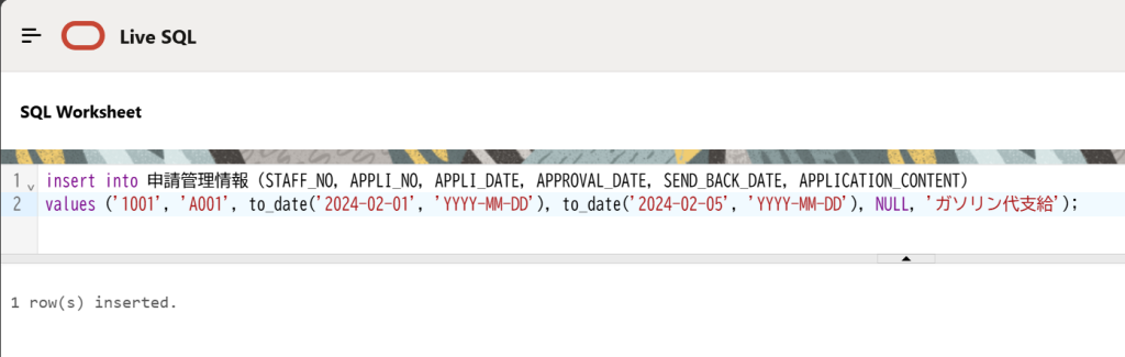 values ('1001', 'A001', to_date('2024-02-01', 'YYYY-MM-DD'), to_date('2024-02-05', 'YYYY-MM-DD'), NULL, 'ガソリン代支給');