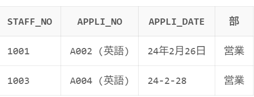 DEPARTMENT = '営業') - 申請番号が ‘A002’ または ‘A004’ のいずれか (