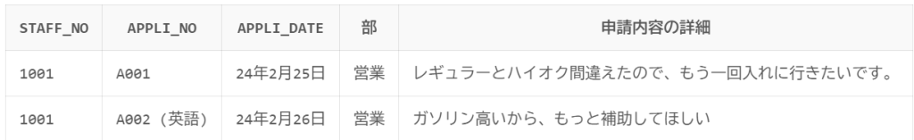 申請内容の詳細 varchar2(100), -- 申請の詳細内容を格納するカラム