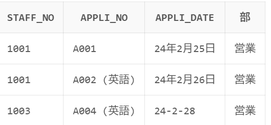 values ('1001', 'A001', TO_DATE('2024-02-25', 'YYYY-MM-DD'),'営業');