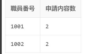 count(*)を使用することで、申請内容の詳細テーブルのレコード数を職員番号ごとにカウントしています。