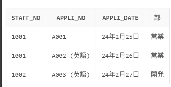 STAFF_NOVARCHAR2 型のため、データ型が NUMBER ではなく文字列として比較される点に注意が必要です。