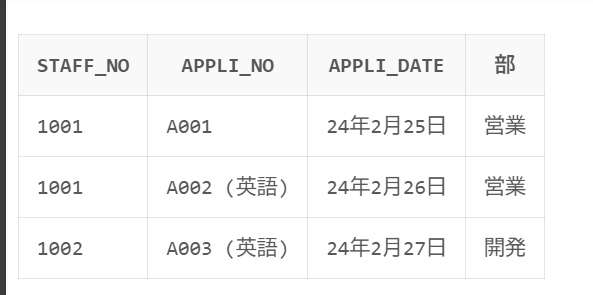 ただし、APPLI_NO に小文字の a003 が含まれていますが、Oracle では大文字・小文字を区別するため、A003 には含まれますが、a003 は取得されません。
