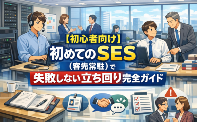 エンジニア 【初心者向け】初めてのSES(客先常駐)で失敗しない立ち回り完全ガイド SES初心者向けに、初めての客先常駐で失敗しない立ち回りを解説。SESを3年経験した筆者の実体験をもとに、客先での仕事の進め方や最初にやるべき行動、評価を落とさないポイントをまとめた完全ガイド。 2026.01.03 エンジニア